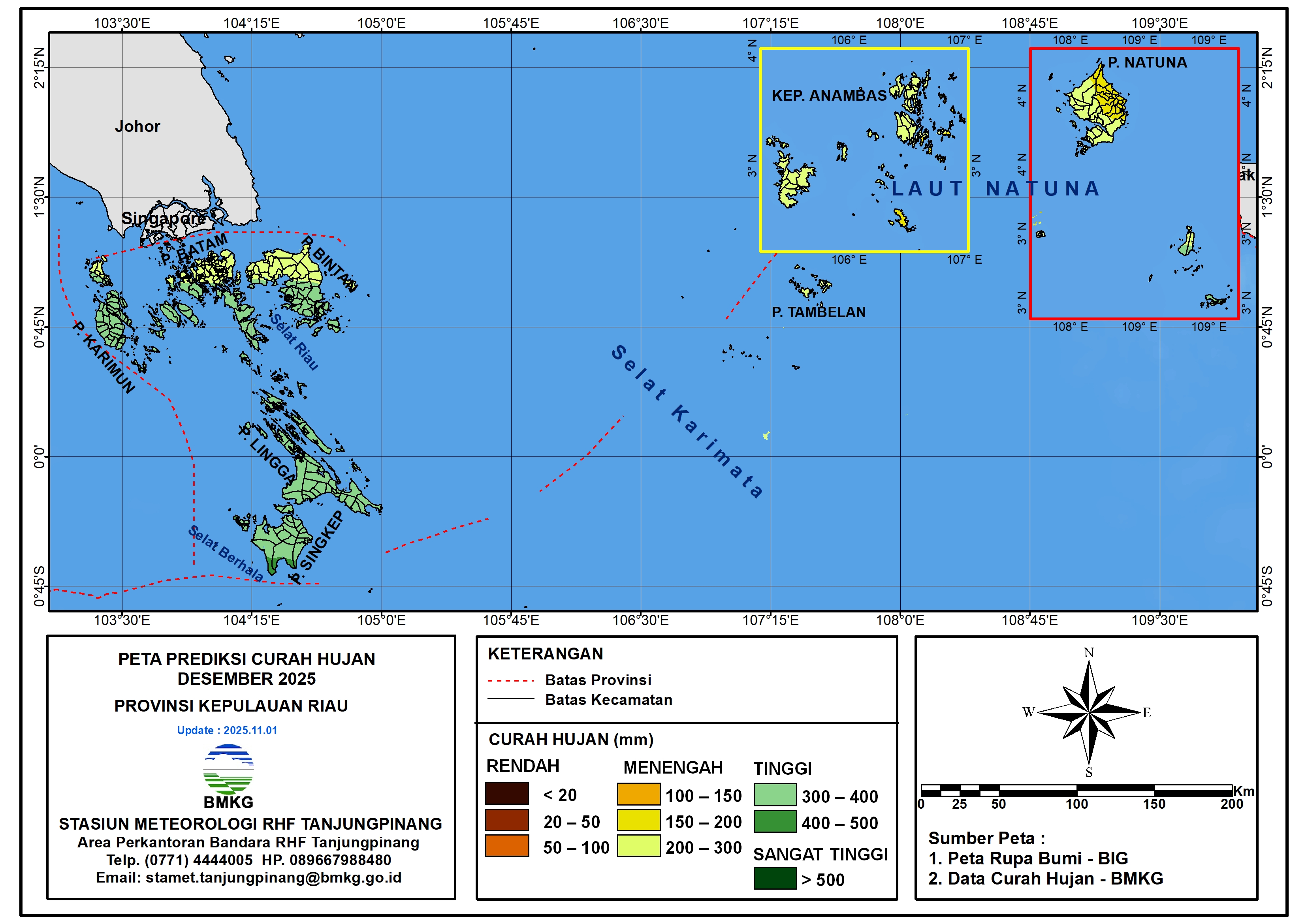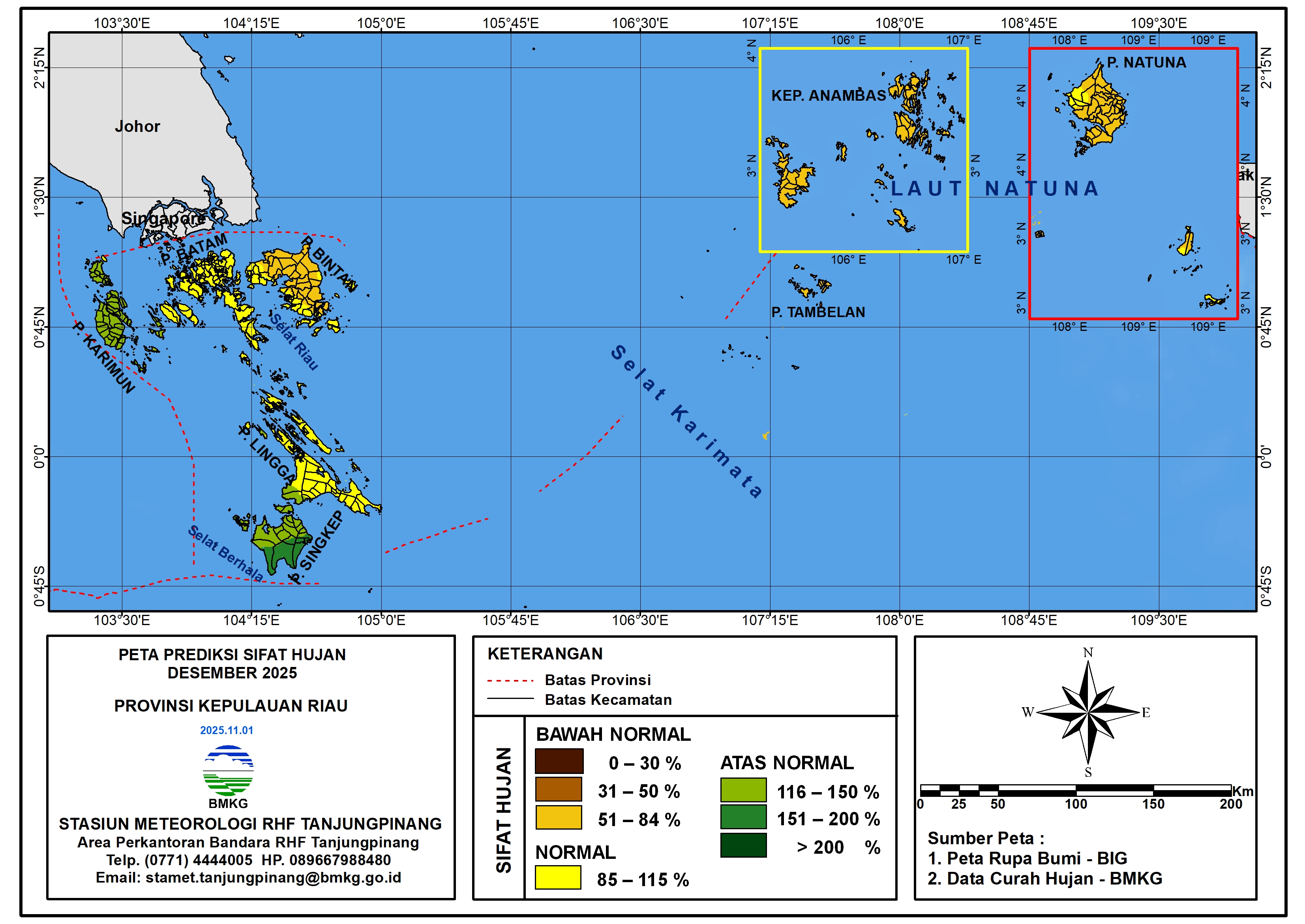 Prediksi curah hujan Bulan Desember 2025 Provinsi Kepulauan Riau secara umum berada pada kategori Menengah hingga Tinggi (200-400 mm/bulan). Sedangkan prediksi sifat hujan Bulan Desember 2025 Provinsi Kepulauan Riau secara umum berada pada kategori Bawah Normal hingga Normal.